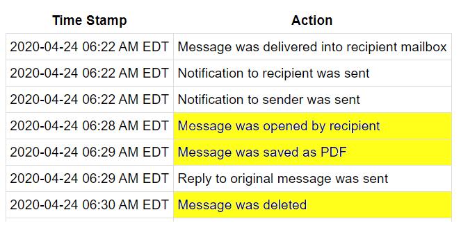 Every single action (delivery open, delivery, print response, download) is recorded in real-time for audits